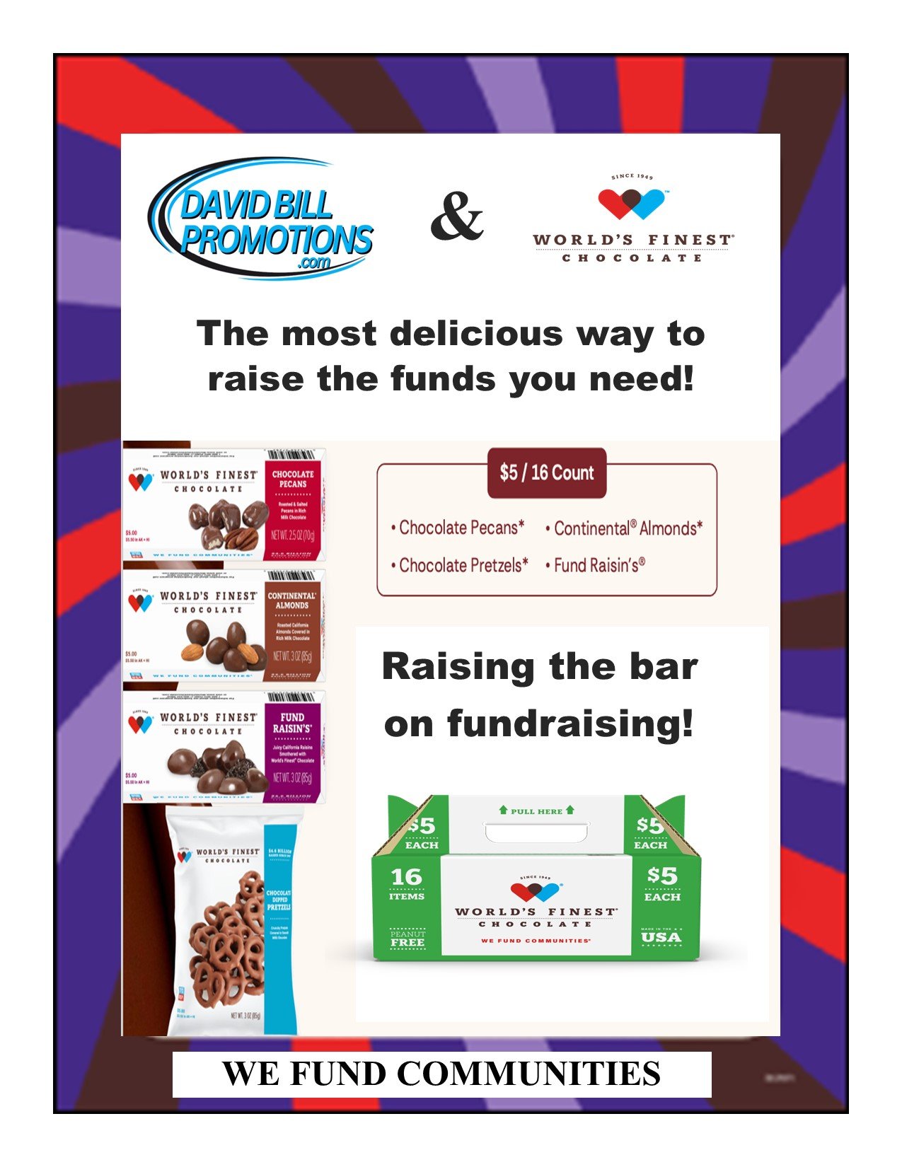 We are happy to announce a new program for Spring of 2026 this year! World’s Finest Chocolate has our new $2.00 & $5.00 product line. We can can continue to offer through Van Wyk Confections; our new $2.00 Nifty 50 Chocolate, Chocolate Covered Pretzels $1.00 and $2.00 products. We can offer a Popcorn order taker that can be bulk shipped, packed per student or shipped directly to the students home. Please click below for more information!